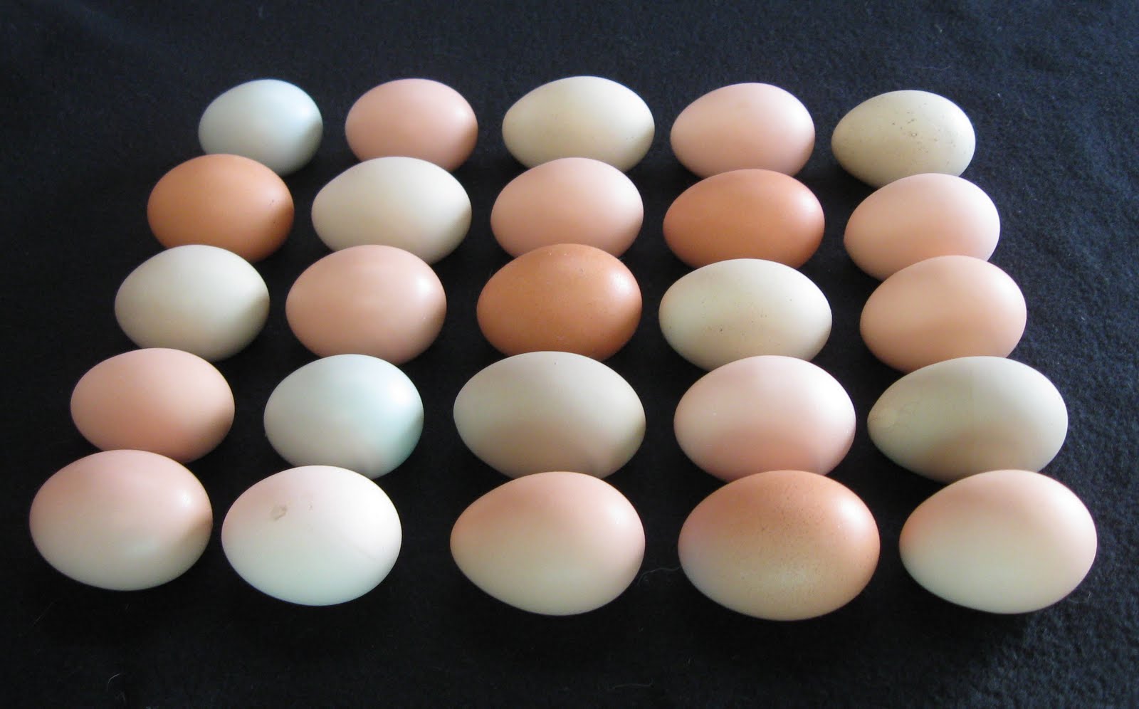 A bowl full of colorful eggs, note the bluish one of Miss Daisy in the foreground to the left, the small darker brown egg behind it is from a Jersey Giant still laying pullet eggs too.